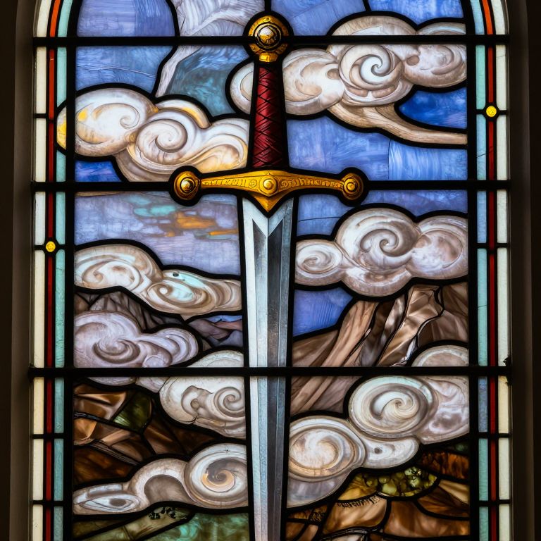 A stained glass window depicting the Lance of Longinus, a sword with a detailed hilt and a background of swirling clouds and mountains.