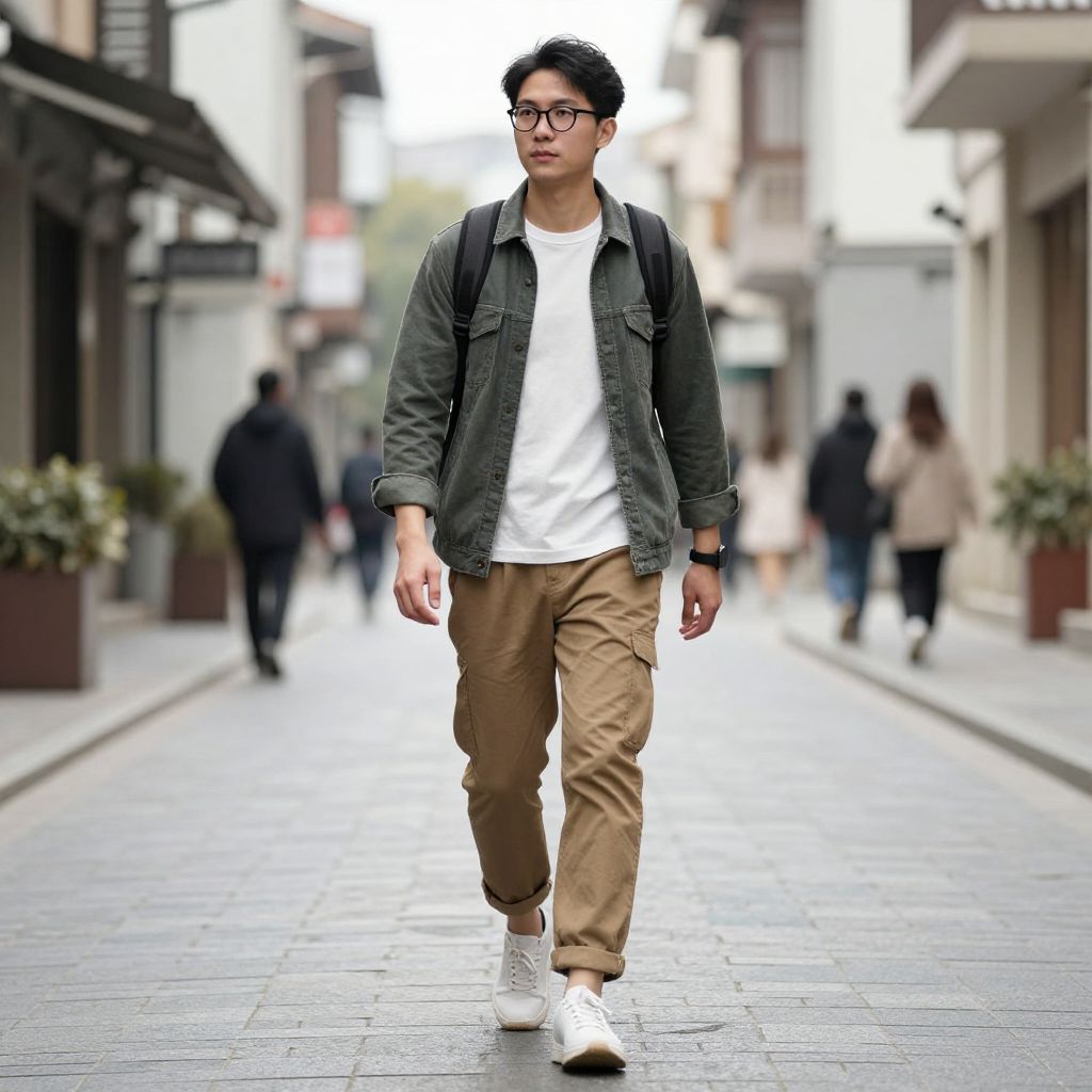 Photograph of an Asian man walking down a slightly blurred urban street. He has short black hair, wears black-rimmed glasses, a dark green denim jacket over a white t-shirt, and brown pants. He completes his outfit with white sneakers. He carries a black backpack and has a neutral expression. The background shows indistinct pedestrians and storefronts with potted plants, suggesting a city environment. The street is paved with gray tiles, and the overall color palette includes muted tones, with the man's clothes standing out against the gray and white background.