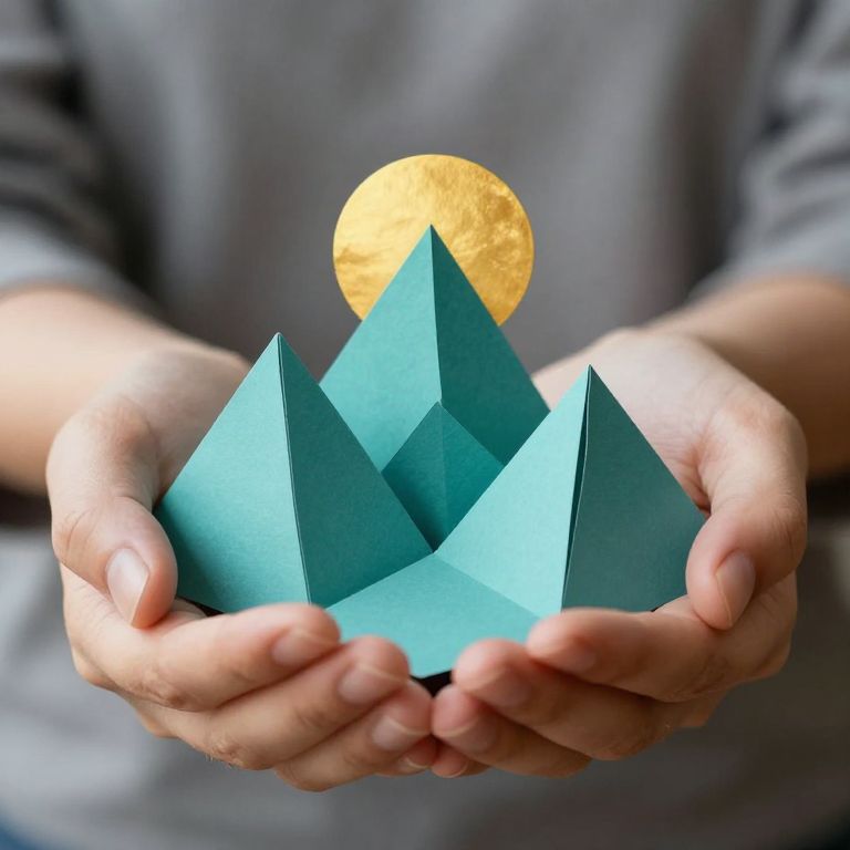 Origami-inspired mountains crafted from vibrant teal paper are delicately held in cupped hands, with a golden sun peeking through the peaks, evoking a sense of timeless wonder and artistic precision.