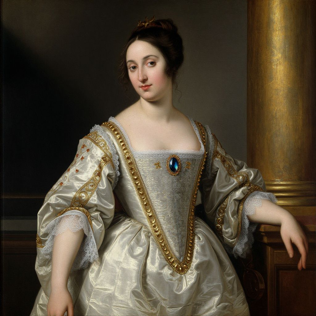 Elegant portrait of a woman by Giovanni Battista Gaulli (Il Baciccio), painted in the 1670s, showcasing her in a luxurious cream gown adorned with gold embellishments, lace trim, and a central jewel, set against a dark, architectural backdrop with a golden column to the right.