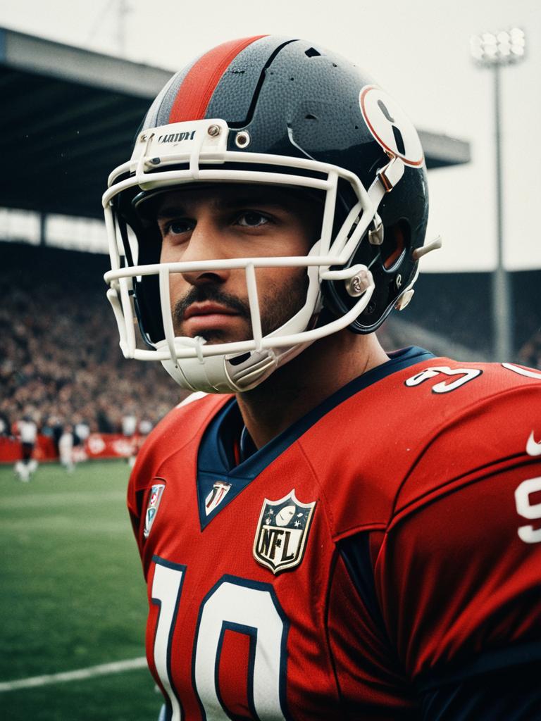 Football player in stylish gear, cinematic realism, heroic athlete portrait