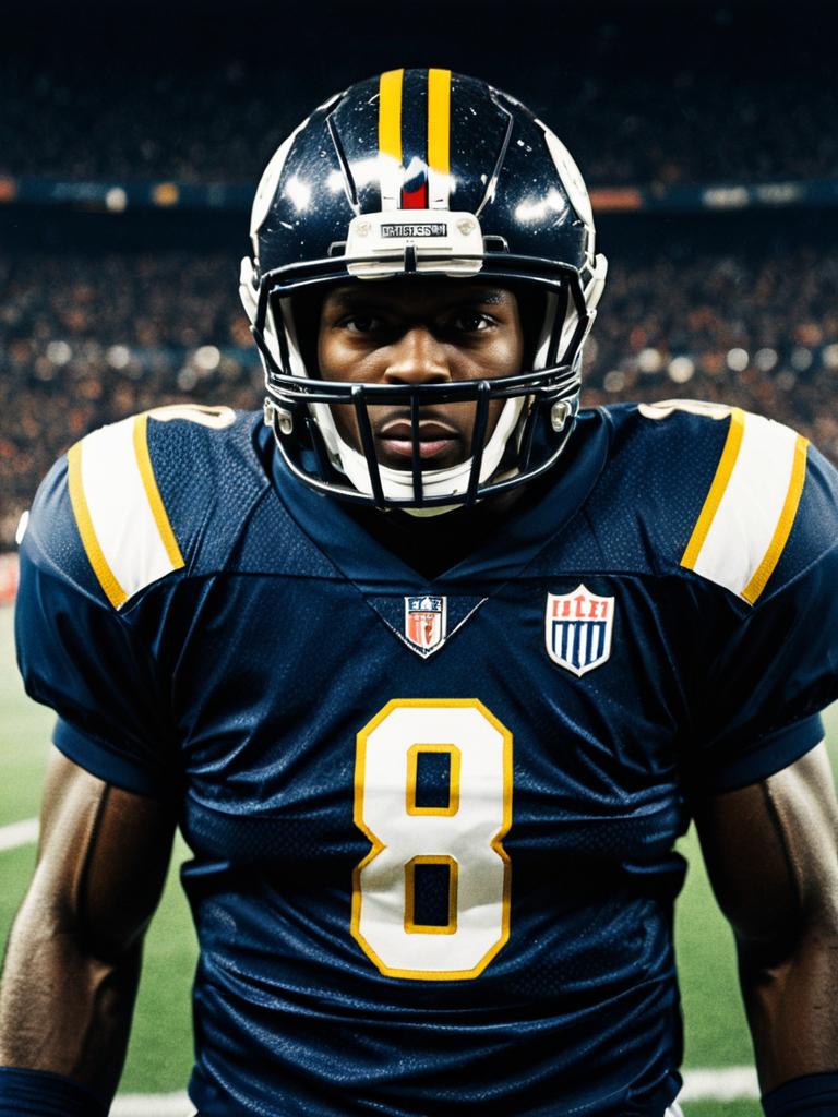 Close-up portrait of an African American male American football player wearing a navy blue jersey with the number 8 and matching helmet with yellow stripes. The player is standing on a football field with a blurred crowd in the background, captured in a cinematic style with dramatic lighting.