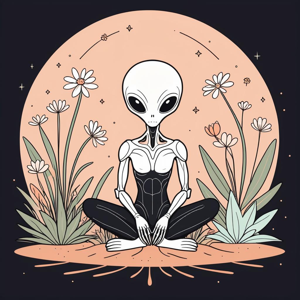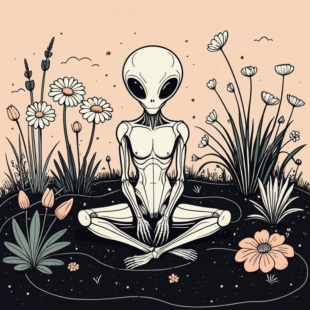 A minimalist cartoon style illustration of an alien figure sitting on a dark patch of ground, surrounded by delicate, tall, thin plants and flowers with simple line art. The color palette includes muted pastel shades with a warm peach background, soft beige and cream flowers, and black and white contrasts on the alien and ground, creating a calm and whimsical atmosphere in a flat, clean style