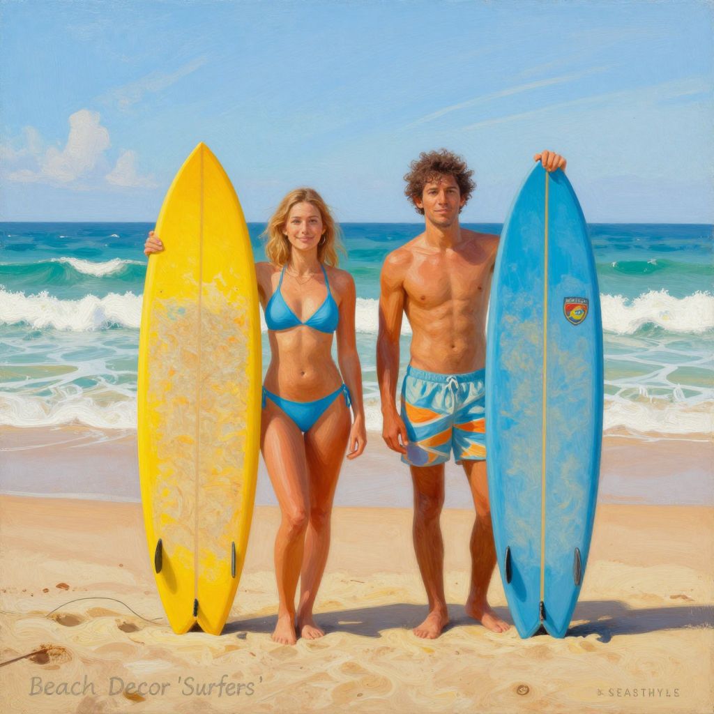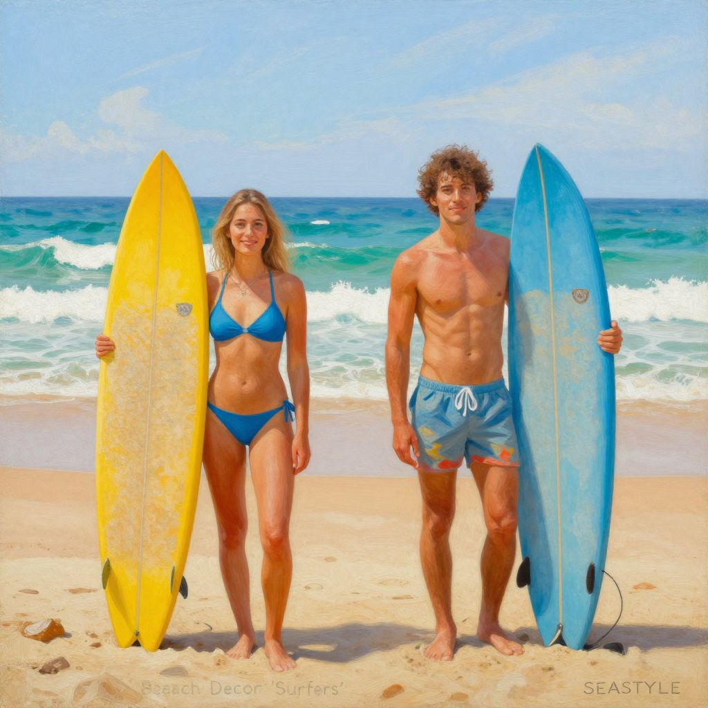 A vibrant oil painting titled \"Beach Decor 'Surfers'\" by B. Kravchenko for SEASTYLE captures two surfers standing on a sandy beach, each holding a brightly colored surfboard—a yellow one for the woman and a blue one for the man—against a backdrop of turquoise waves and a clear sky, rendered with vivid realism and warm, inviting tones.