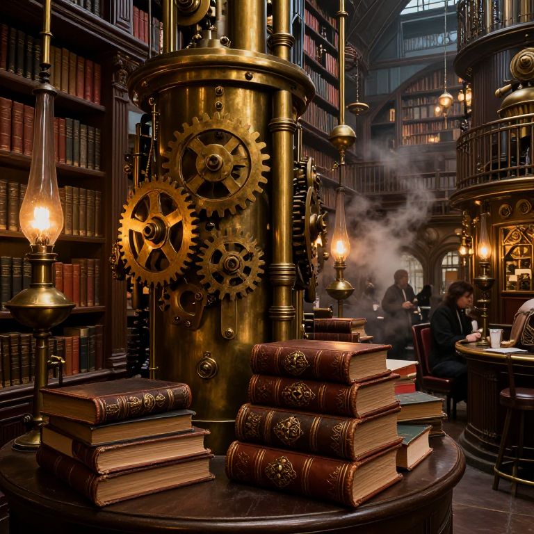 Bibliothèque in a bustling steampunk city, brass and copper gears integrated into furnishings, leather bound books with intricate metallic embellishments, warm gaslight lamps, steam rising gently, Victorian industrial style, a lively yet intellectual environment