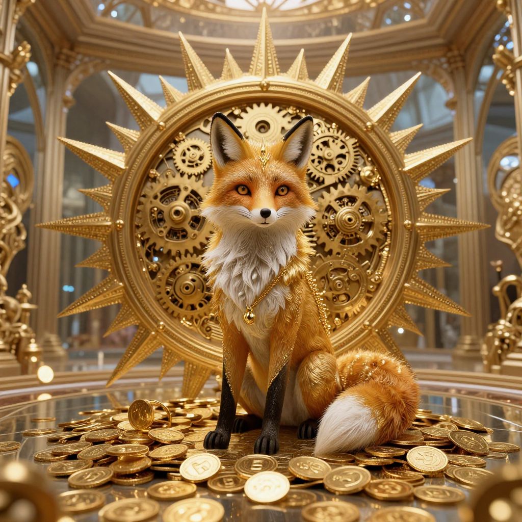 Photorealistic CGI of a regal fox with golden, metallic fur, sitting on a floor of coins, in front of an ornate, sun