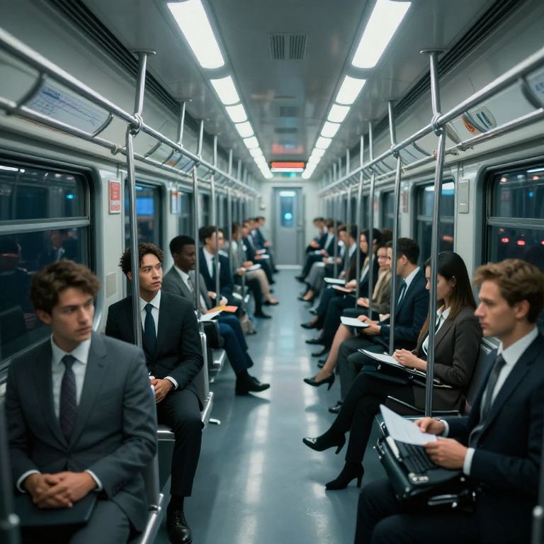 In a cyberpunk-inspired 3D-rendered scene, a train car filled with formally dressed commuters glides through an endless tunnel illuminated by stark fluorescent lights, creating a surreal mirror effect where each passenger's reflection hints at alternate versions shaped by unseen decisions.