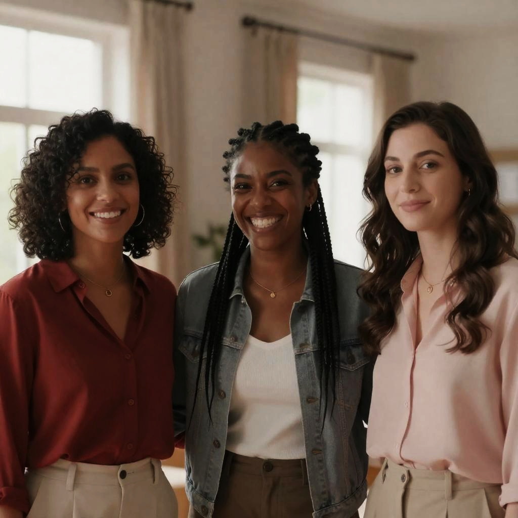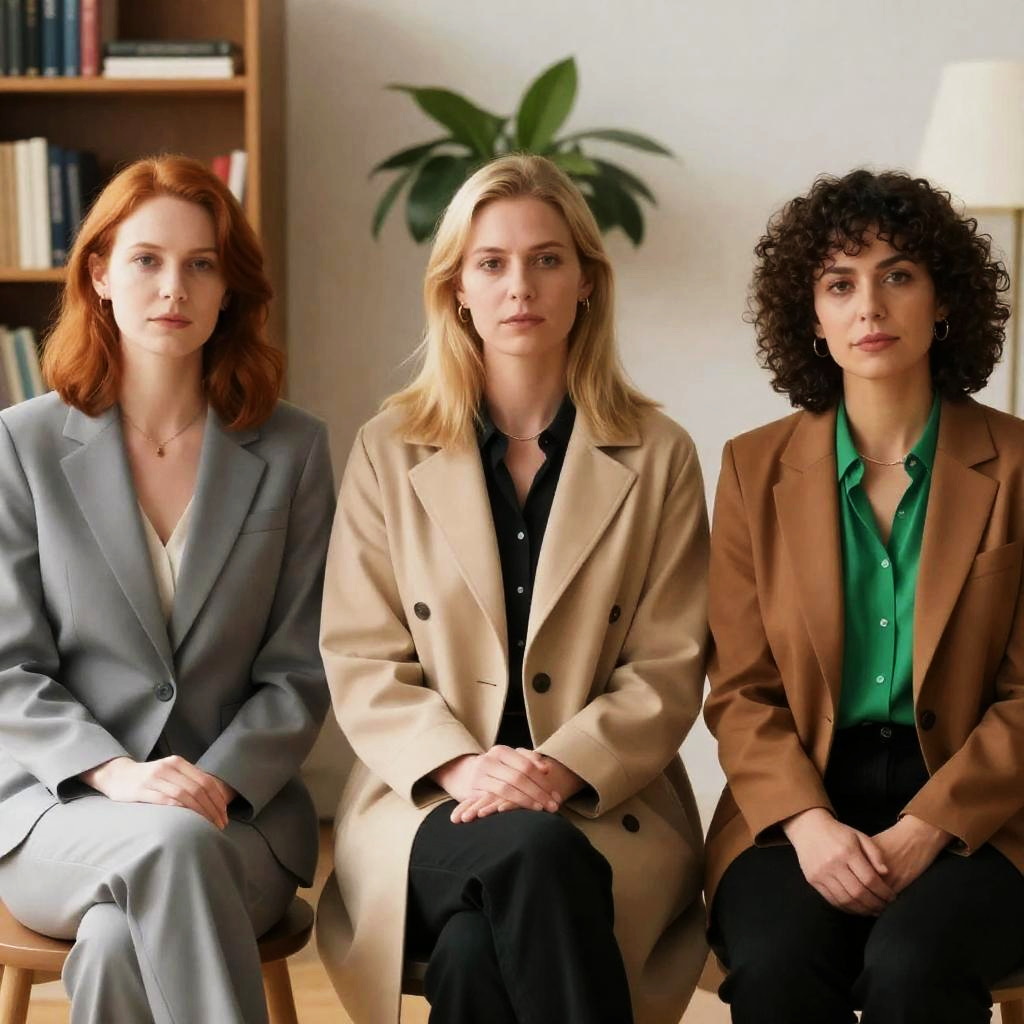 Photograph of three women in an office. Woman on left, red beanie, green jacket, smiling, hands in pockets. Center woman, blonde, gray shawl, serious expression, hands clasped. Right woman, curly brown hair, yellow coat, thoughtful, finger on chin. Bookshelves, plant, lamp in background. Desk with papers, pen in foreground. Casual, candid setting.