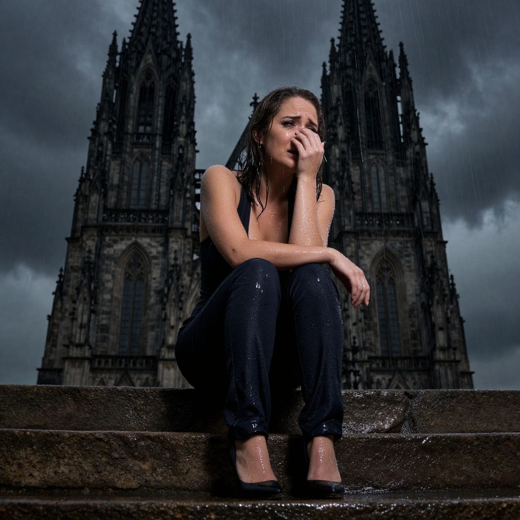 Photograph of a wet, young woman with long black hair, sitting on stone steps in front of a Gothic cathedral with twin spires under a dark, stormy sky. She is wearing a sleeveless black top and black pants, with her right hand covering her mouth and her left arm resting on her knee. Her black high-heeled shoes are also wet. The cathedral's intricate stone details are visible in the background, contrasting with the moody, overcast atmosphere. The image has a dramatic, atmospheric quality with high contrast and sharp details.