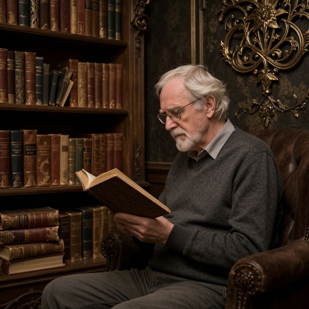 Photograph of an elderly white man with white hair and a beard, wearing glasses and a dark gray sweater over a light blue shirt, sitting in a vintage, ornate library. He is reading a large, old book with a thick, brown cover. The background features tall wooden bookshelves filled with leather-bound books, and an intricate gold-framed wall mirror. The man is seated on a dark brown, tufted leather armchair, and the lighting is warm, highlighting the rich, dark wood and leather textures. The atmosphere is scholarly and nostalgic.
