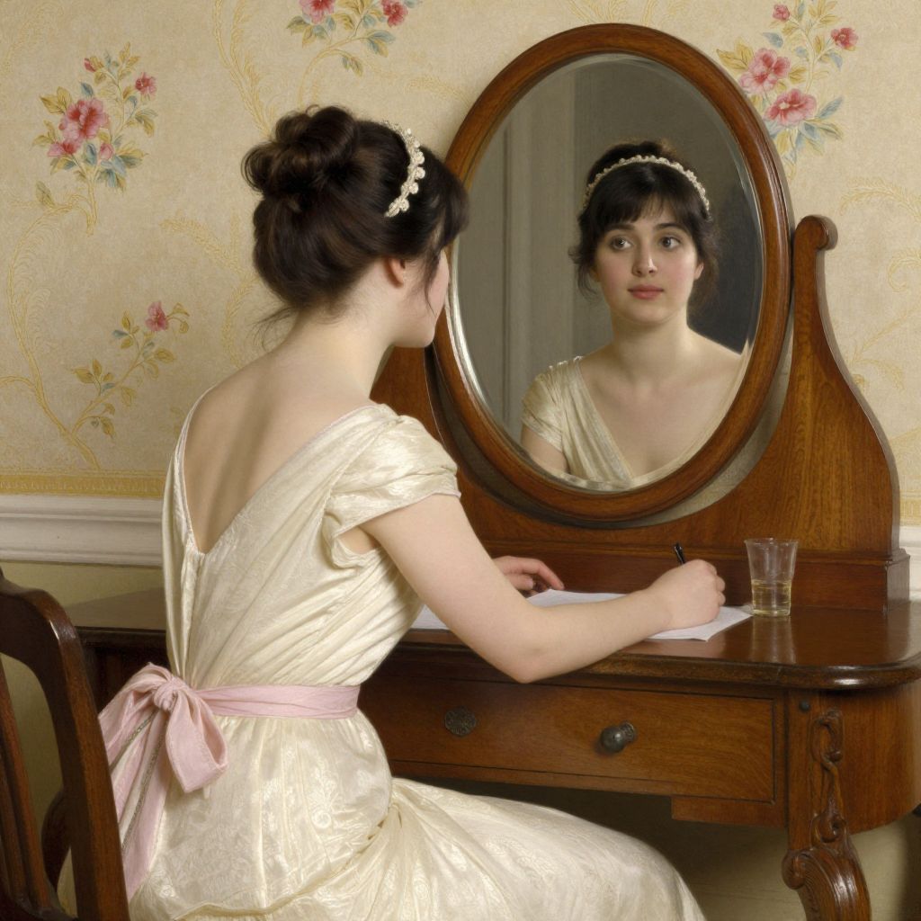 This digital painting depicts a fair-skinned woman with dark brown hair styled in an updo, adorned with a pearl headband, sitting at a wooden vanity table. She wears a cream-colored, satin dress with pink sash and pink ribbon at the back, and gazes at her reflection in the oval mirror. Her left hand rests on her chin, and her right hand holds a pen over a piece of paper on the table. The vanity has a small, cylindrical silver container to the left. The wallpaper behind her is floral with pink roses and green leaves. The scene is softly lit, creating a vintage, romantic atmosphere.