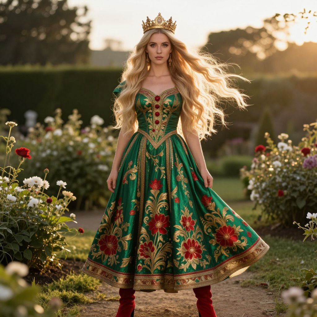 A woman with long, flowing blonde hair, standing elegantly in a sunlit garden, wearing a sophisticated red dress with intricate gold embroidery that catches the light, paired with a stylish red hat adorned with delicate floral details. She has a serene expression, soft blue eyes, and a timeless, graceful demeanor, exuding confidence and charm in a vintage-inspired setting with blooming roses and greenery in the background.