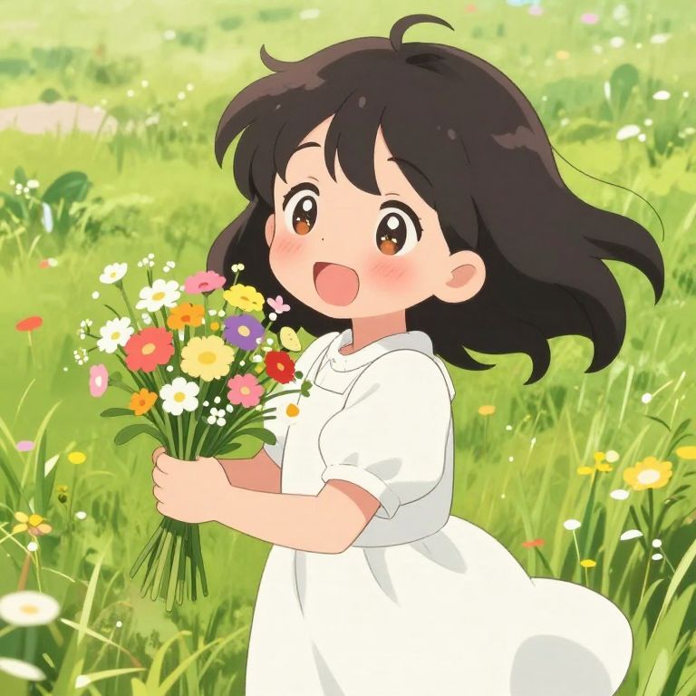 Sonrojada anime-style character with flushed cheeks, sparkling eyes, holding a bouquet of wildflowers, bright sunny meadow background, vibrant colors, dynamic pose, whimsical and cute atmosphere.
