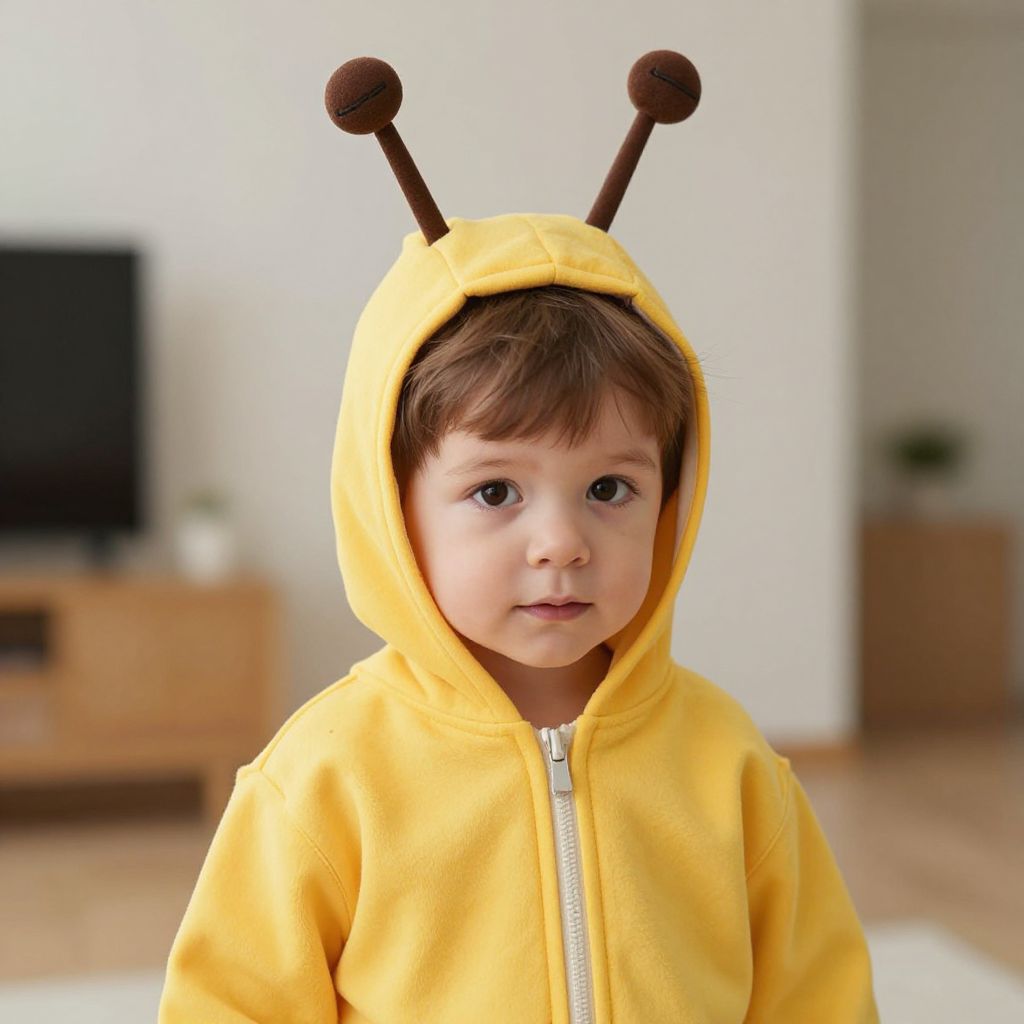 Photograph of a young boy with fair skin and brown hair, wearing a yellow hooded onesie with brown antennae, standing in a bright,