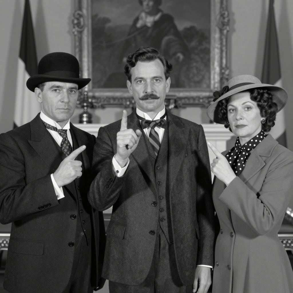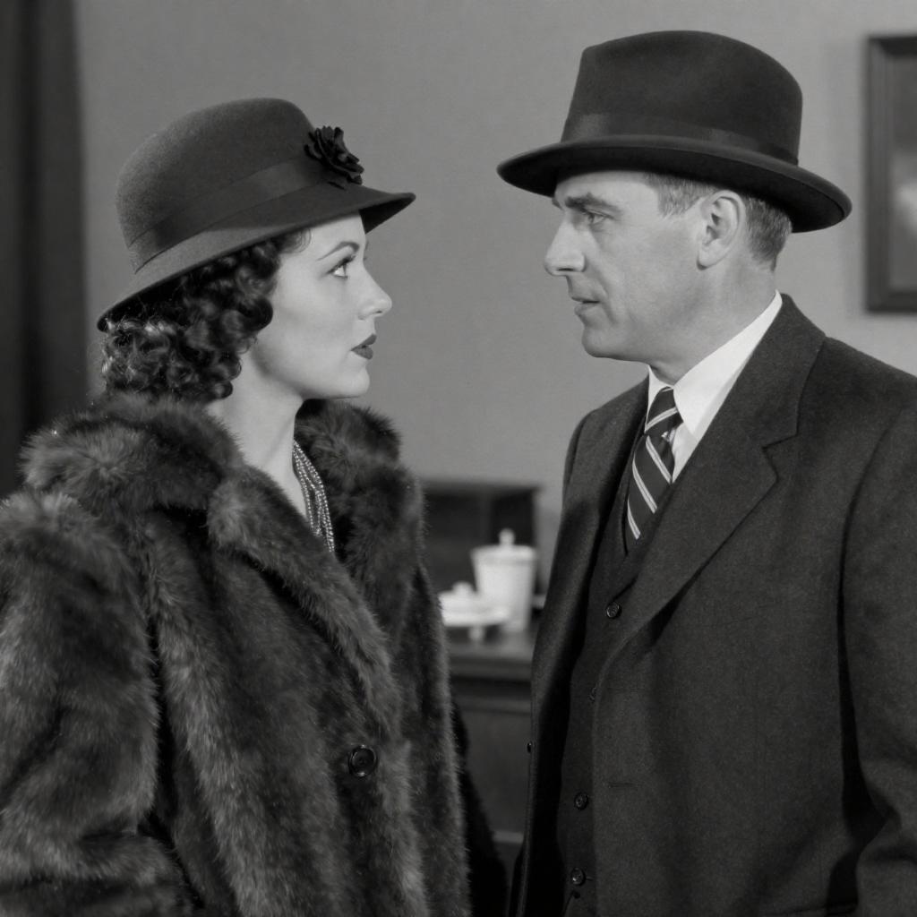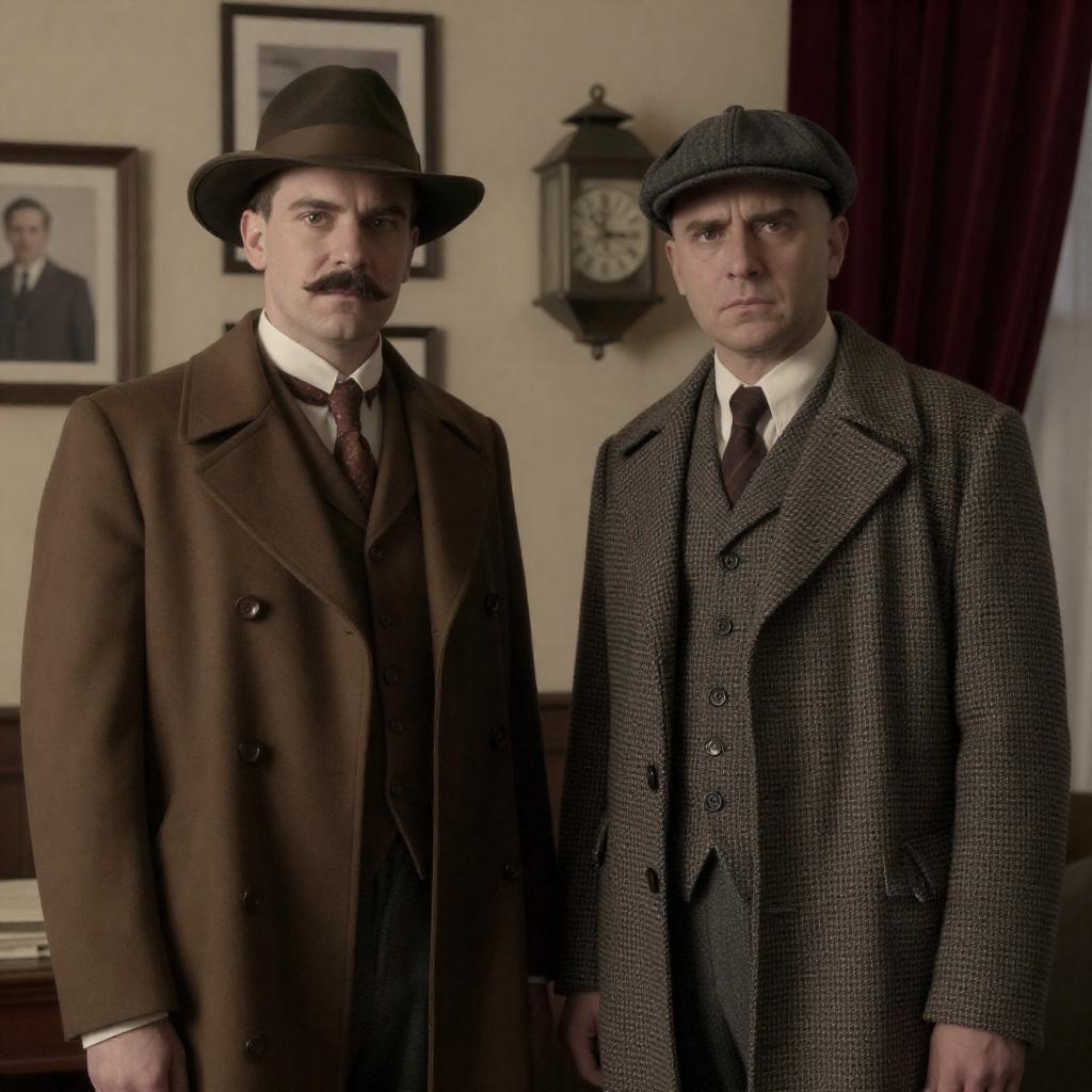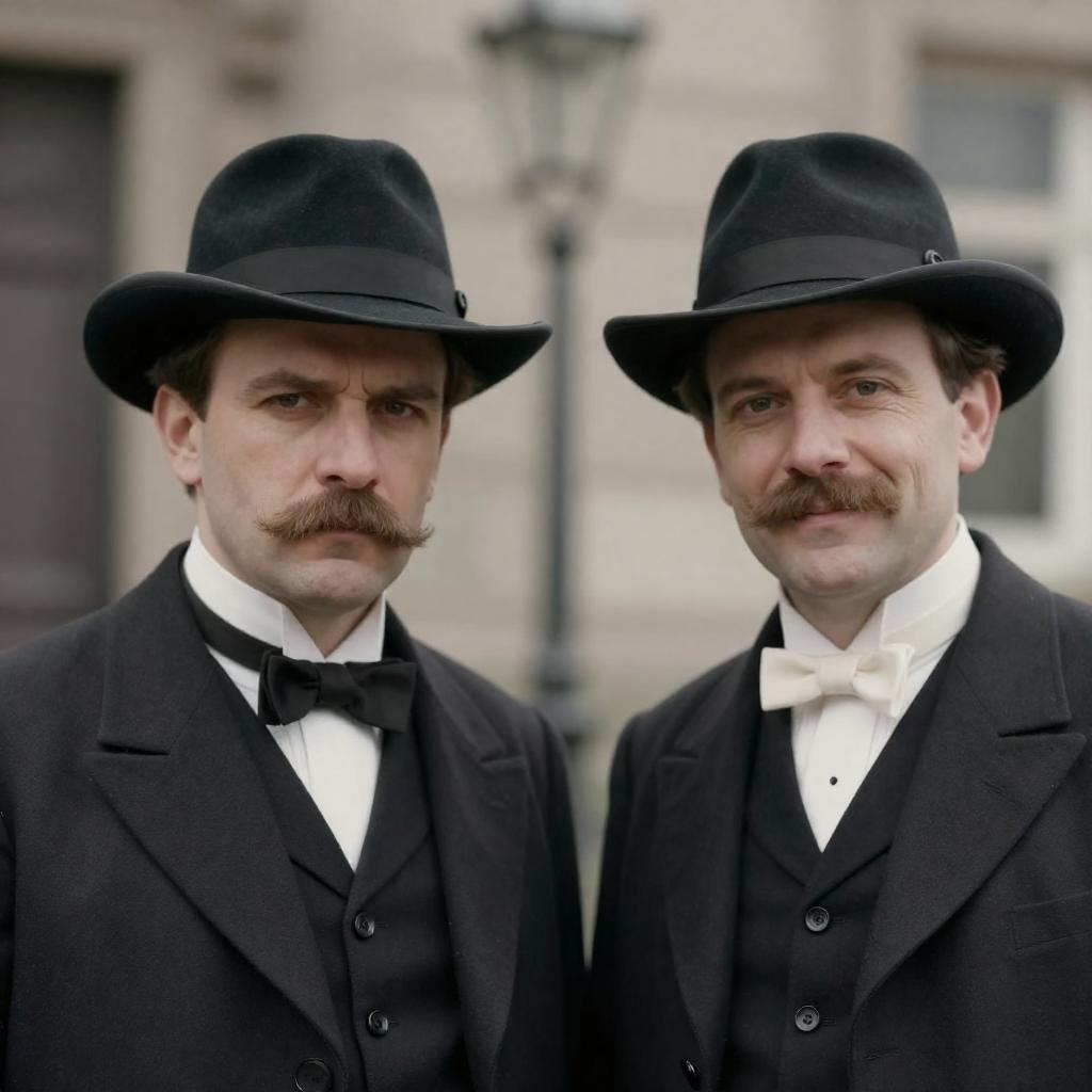 Black-and-white photograph of two men in early 20th-century attire. Both wear hats and suits, facing each other. Left man has stern expression, right man has intense, focused look. Background features wooden cabinet. Both have short hair.