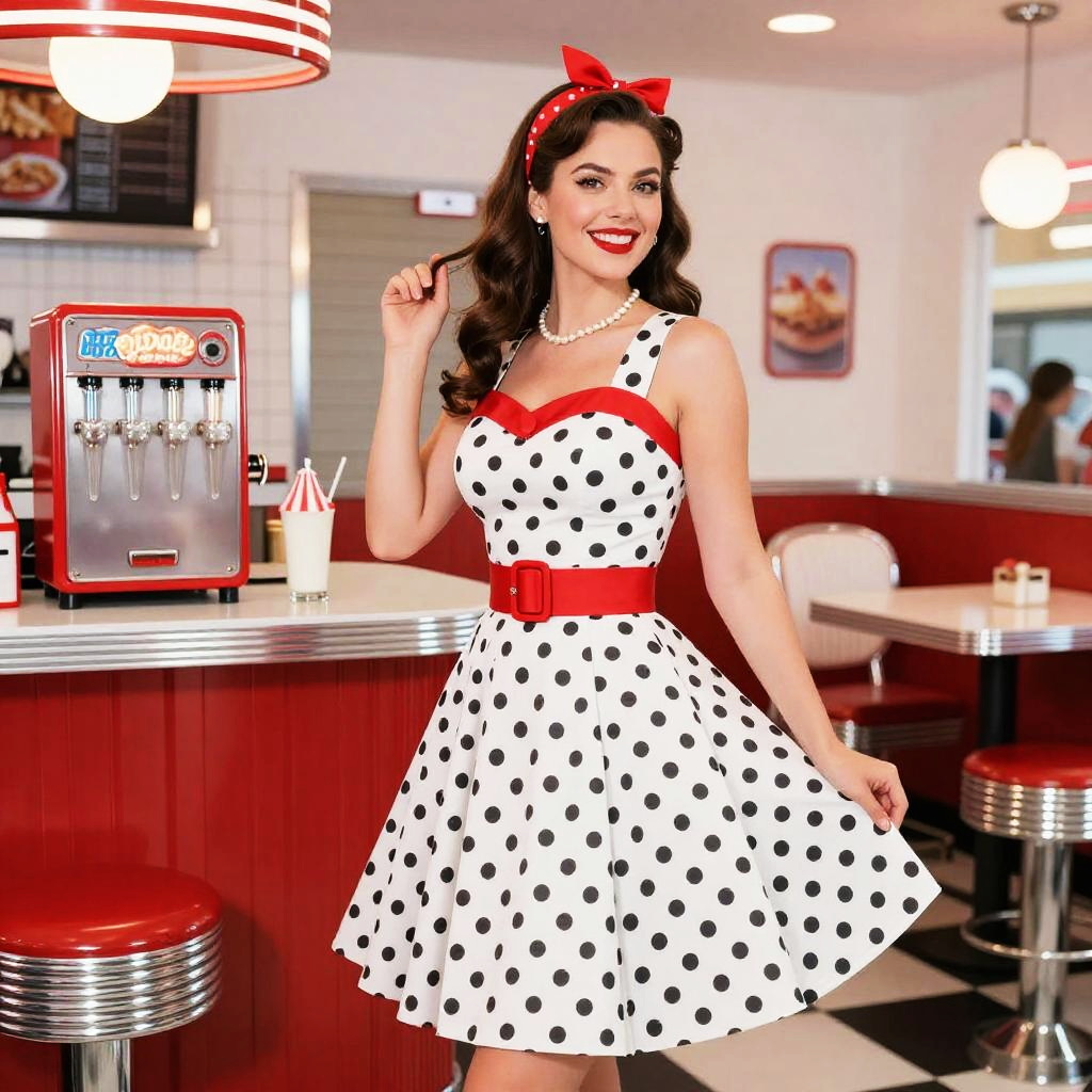 A stylish woman dressed in a classic 1950s polka dot dress with a red belt and matching headband poses cheerfully in a retro diner. The vibrant red and white interior, complete with vintage soda fountain equipment and bar stools, perfectly complements her nostalgic pin-up look.