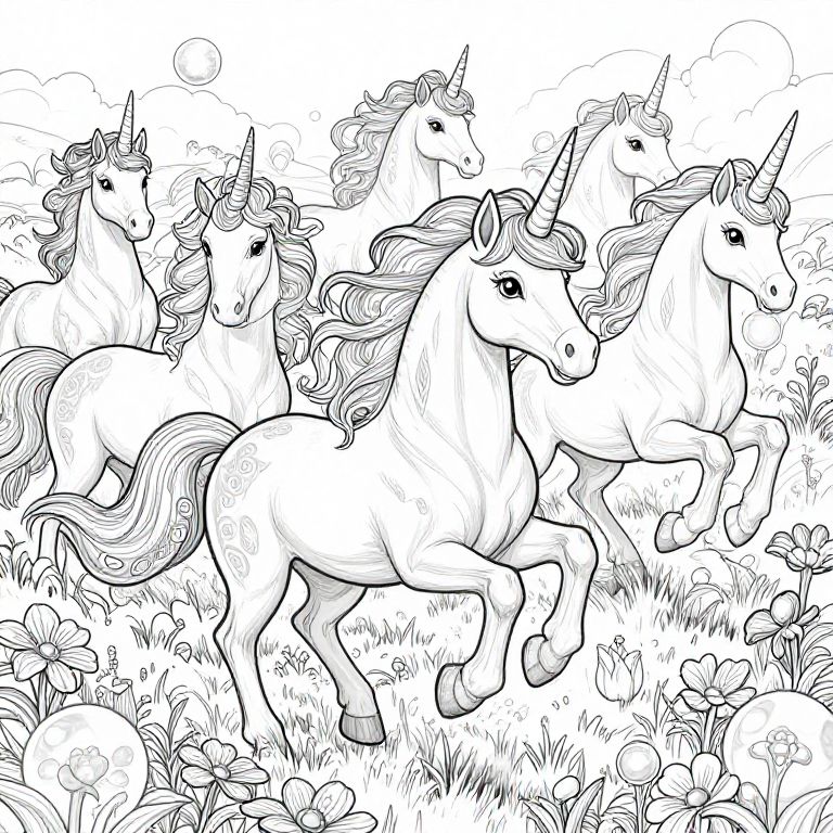 Unicorns coloring page showcasing a herd of unicorns galloping through a mystical meadow filled with magical flowers and glowing orbs, fine detailed linework creating elaborate patterns in their manes and surroundings, fantasy art style, ready for coloring