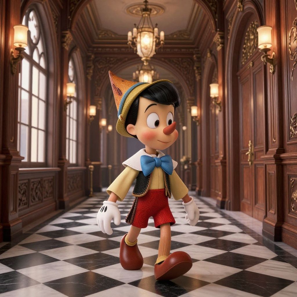 A detailed and colorful depiction of the animated character Pinocchio walking inside a grand mansion hallway. The hallway features gothic arch windows, intricate wood paneling, and a black-and-white checkered marble floor. Elegant chandeliers and wall sconces illuminate the space, adding to the luxurious atmosphere.
