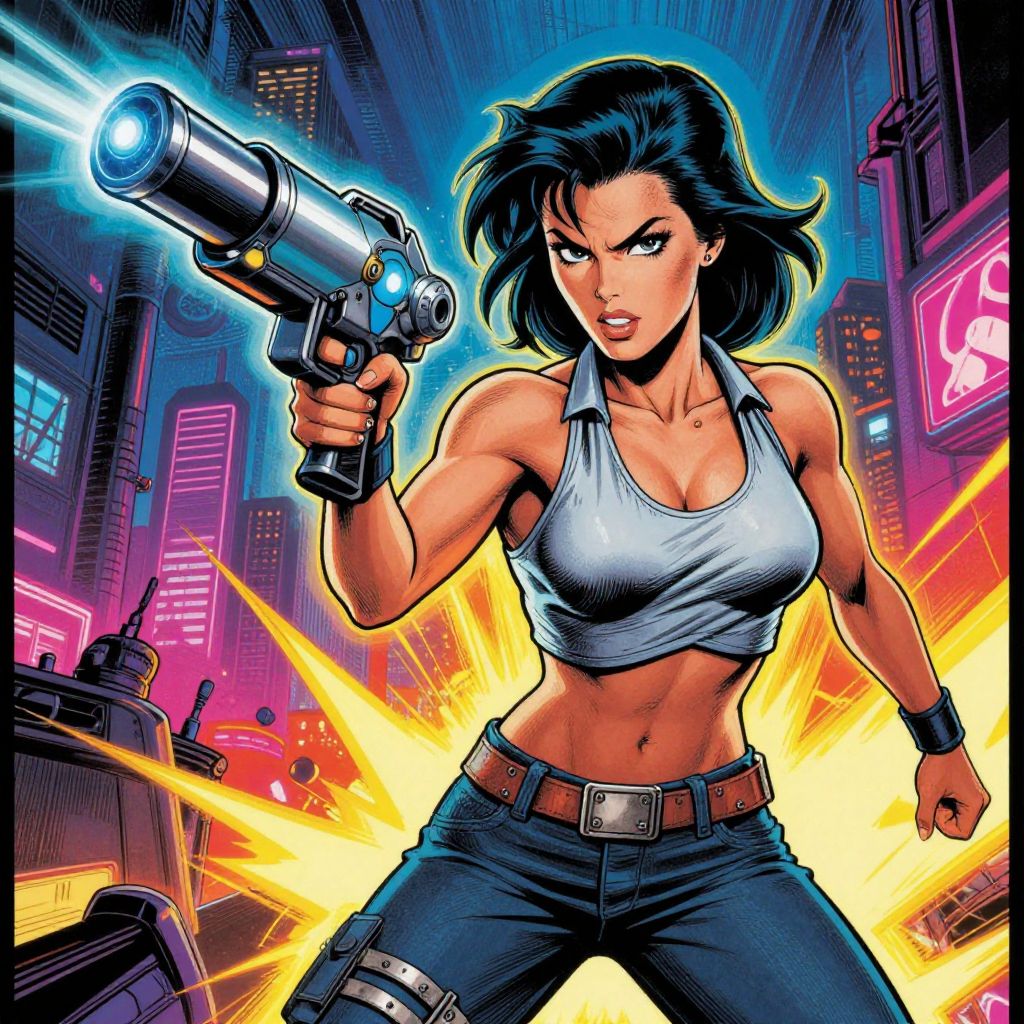 Comic-style digital art: muscular woman with black hair, white tank top, and blue jeans, aiming a glowing blue gun in a neon-lit,