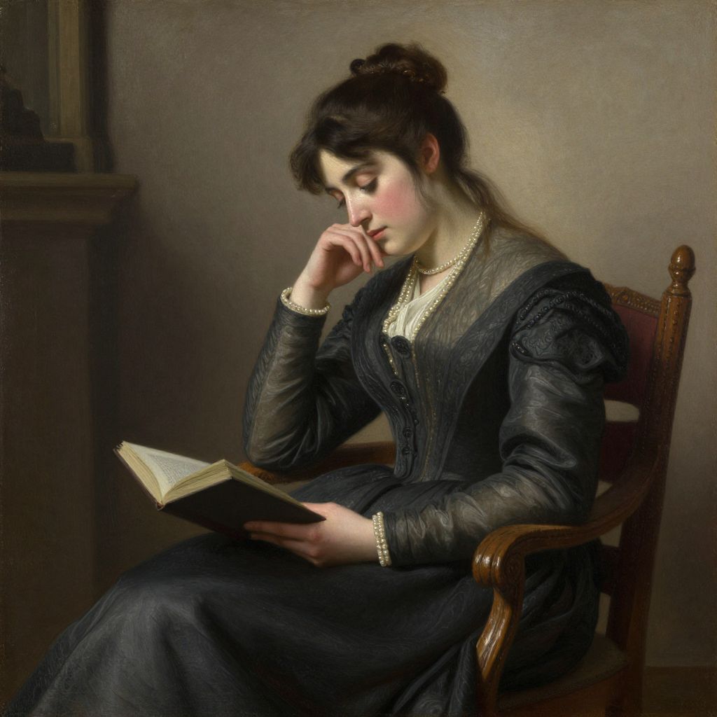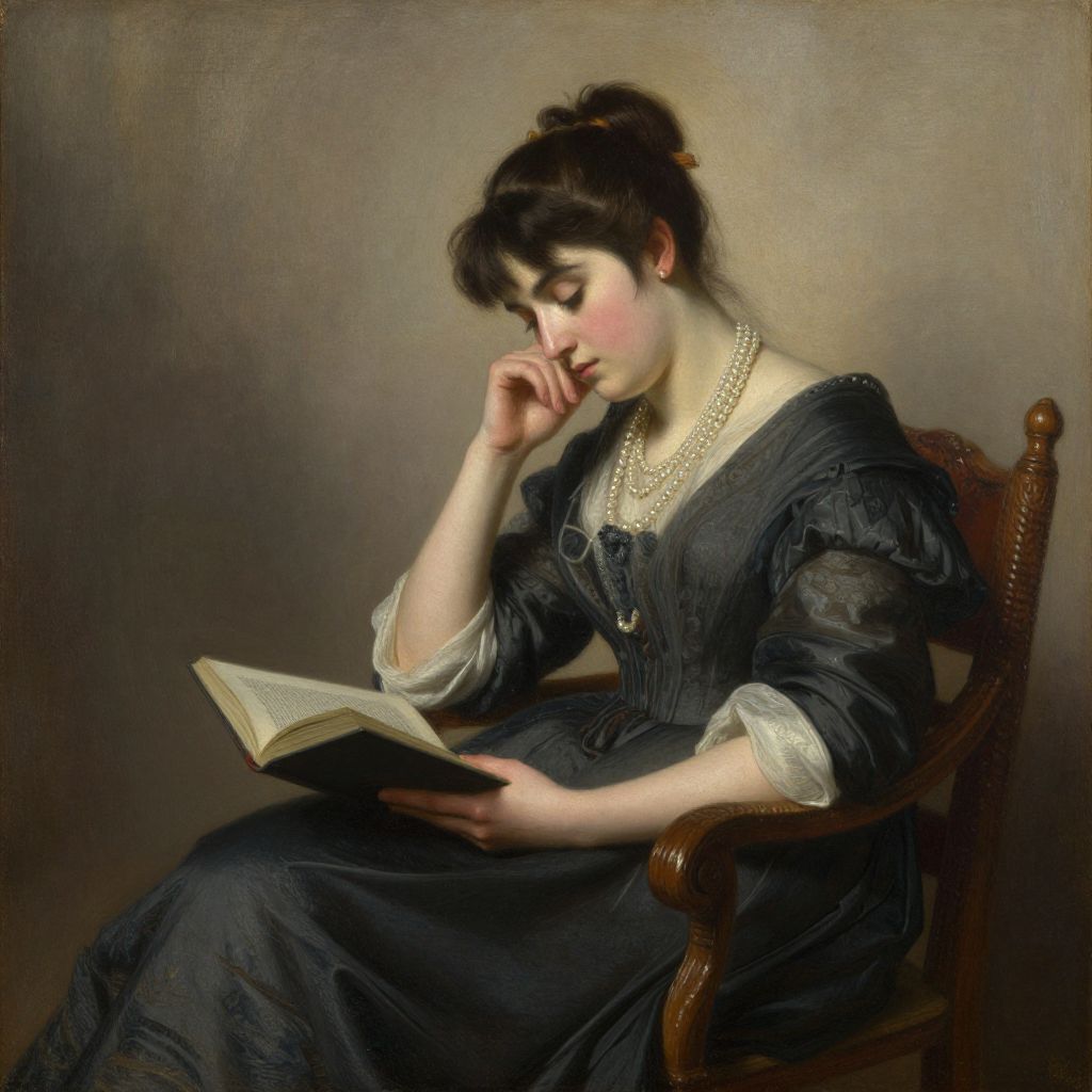 Classical oil painting of a pensive woman with dark hair in an updo, wearing a black dress and pearl necklace, reading a book while seated