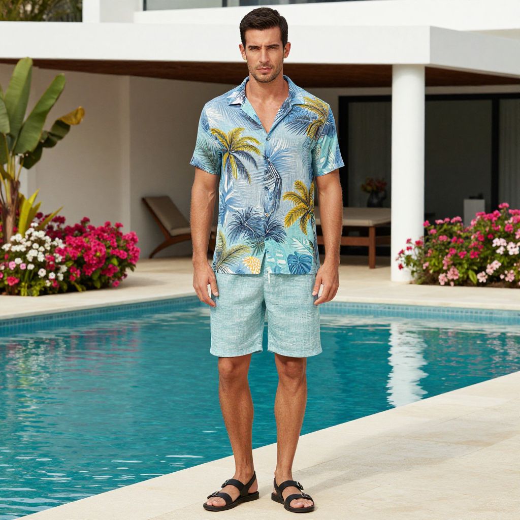 A man, short-sleeve patterned shirt, relaxed-fit shorts, sandals, breathable linen blend, tropical colors and prints, modern villa, shimmering pool, vibrant flower beds, Audrey Flack style.Man has masculine face and piercing eyes