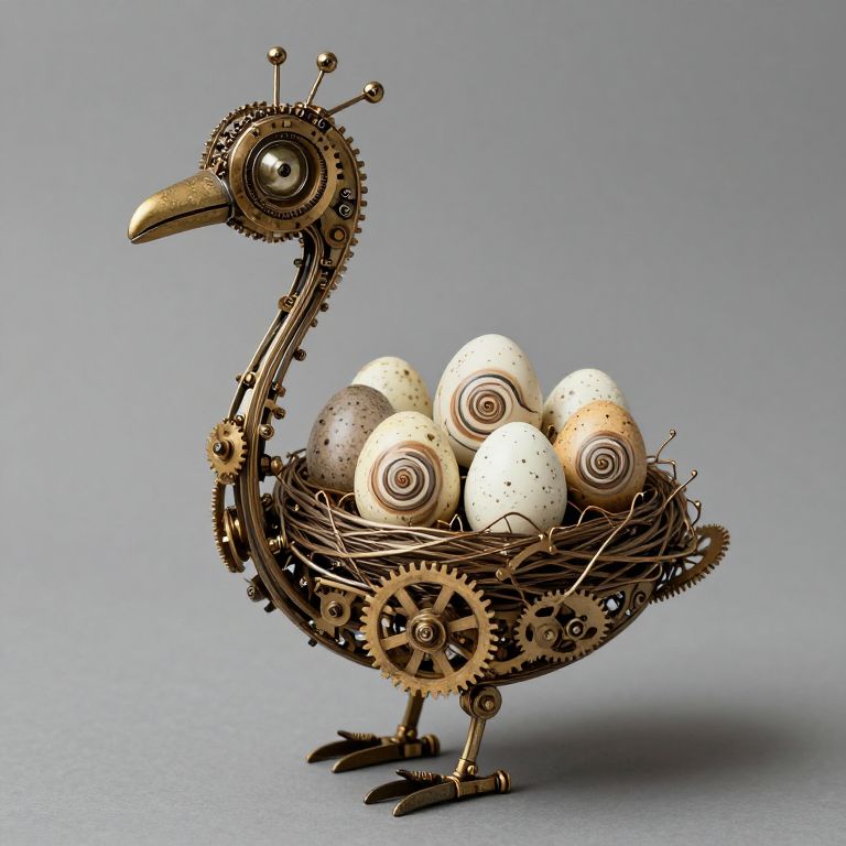 Steampunk-style, intricately crafted, metallic bird holding six white, spiral-patterned eggs in a woven nest, set against a gray background.