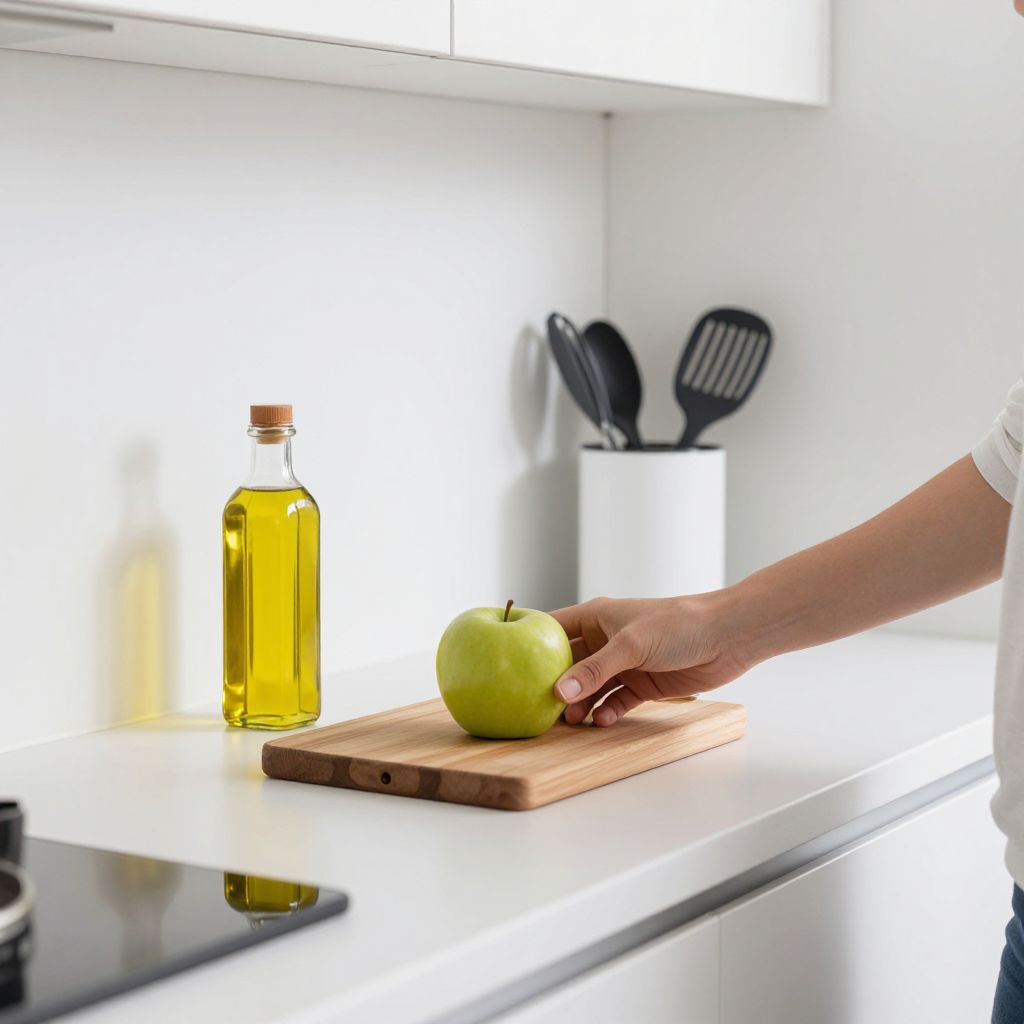 Woman organizing kitchen countertop with a green apple resting on a wooden cutting board, a bottle of oil nearby, and a cylindrical container holding various utensils, all set against a clean white backsplash and cabinetry.