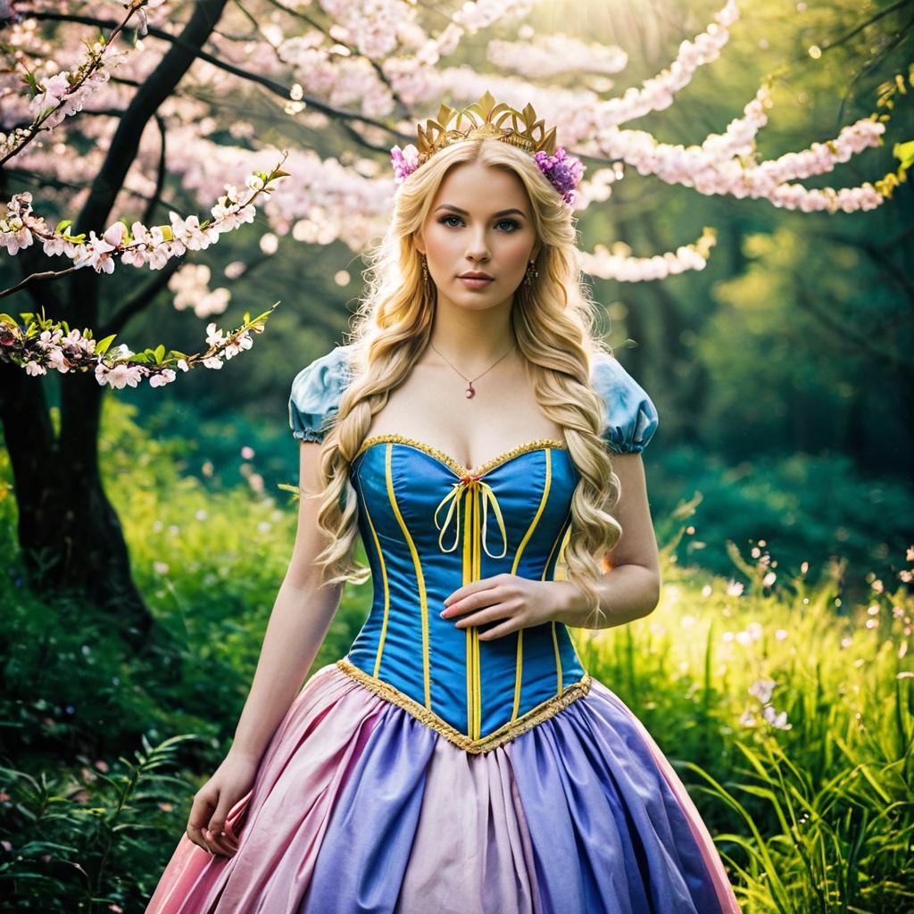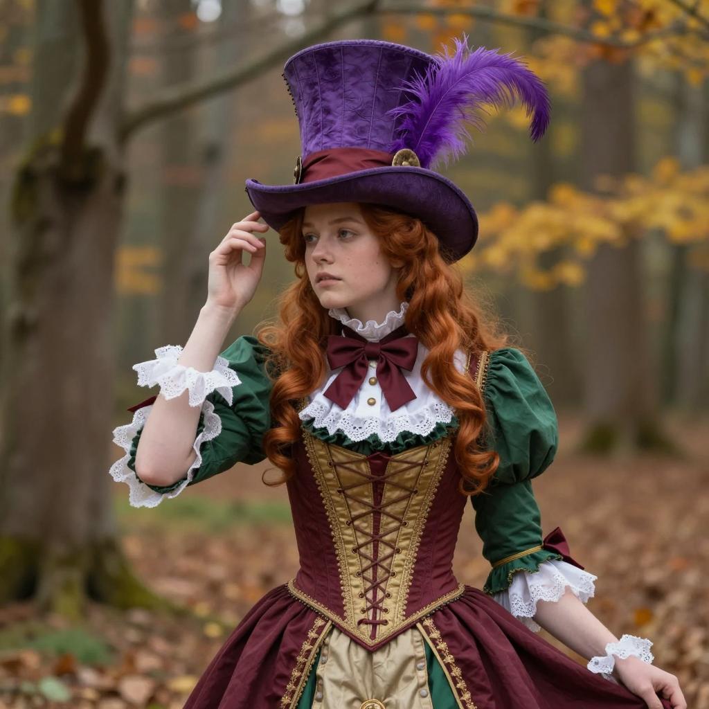 Violet willy wonka cosplay, photorealistic, blonde woman, Victorian Alice in Wonderland dress, purple and orange floral pattern, puffed sleeves, purple bow tie, purple top hat with purple flower, standing in lush garden, purple wisteria flowers, greenery, colorful flowers, daylight, detailed ures, realistic lighting, soft focus background, elegant, fantasy attire, fantasy setting, young adult, fair skin, blue eyes, slight smile, portrait, digital art
