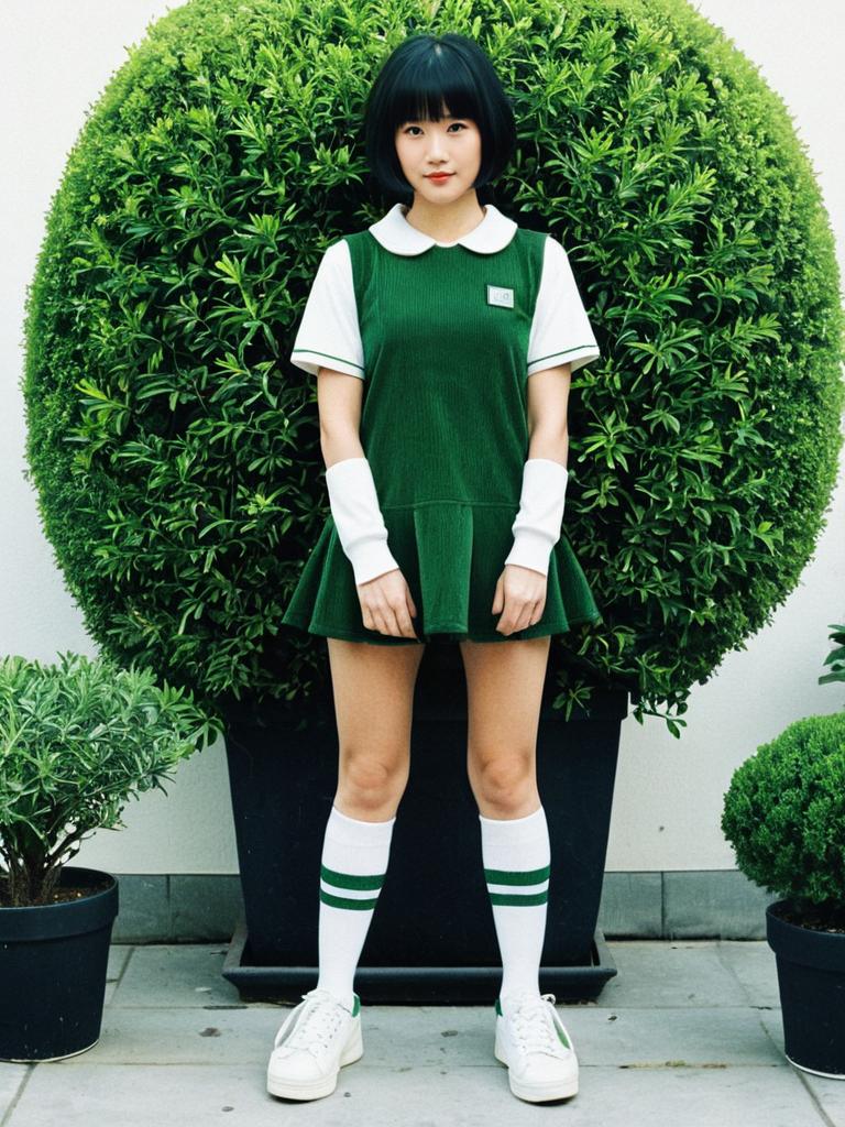 Green bush adult costume, solo, plant, outdoors, day, 1girl, potted plant, shoes, white footwear, standing, socks, looking at viewer, own hands together, short hair, black hair, full body