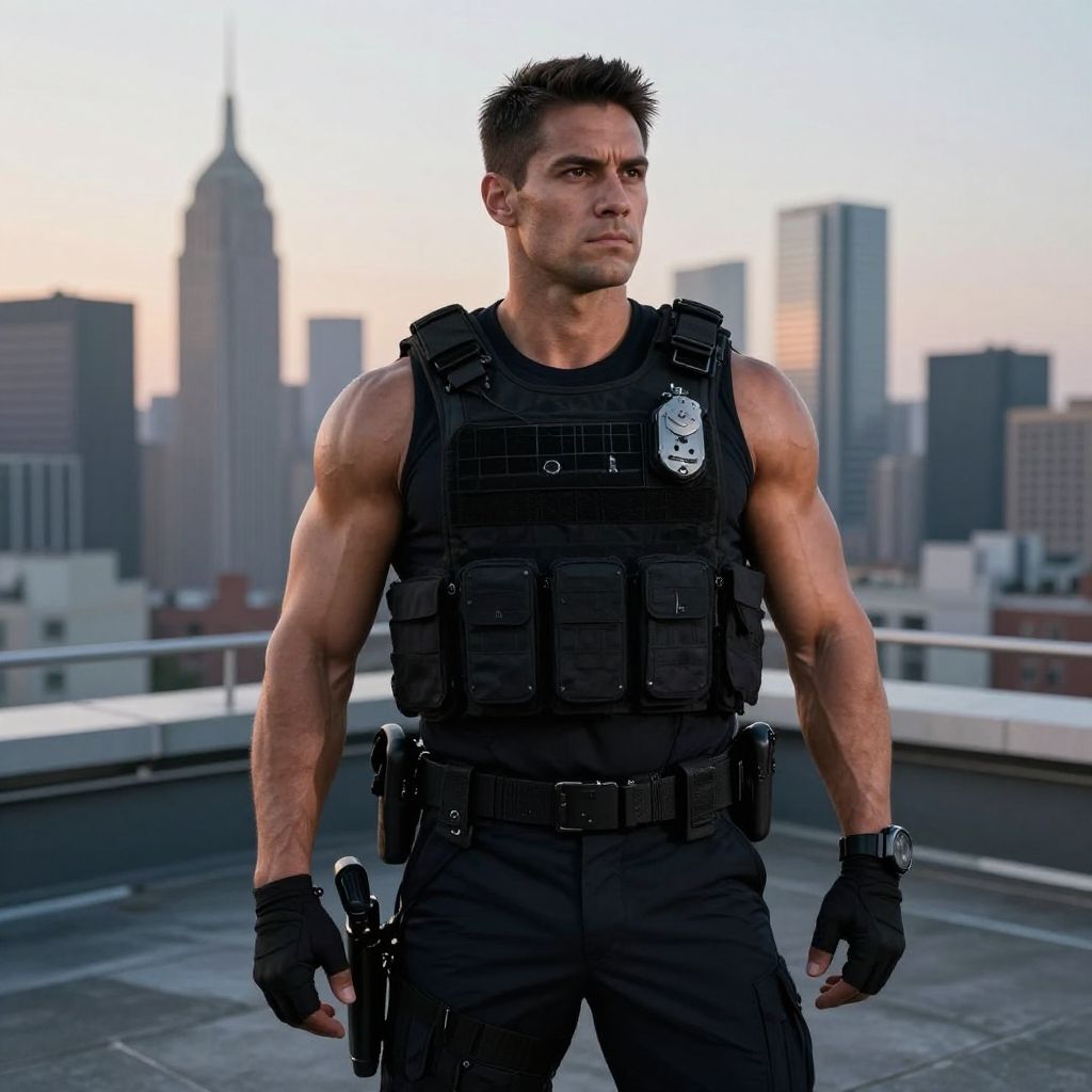 Muscular cop on rooftop overlooking city skyline at dawn, tactical vest and gear, dawn light accentuating muscles, cinematic, high detail and realism