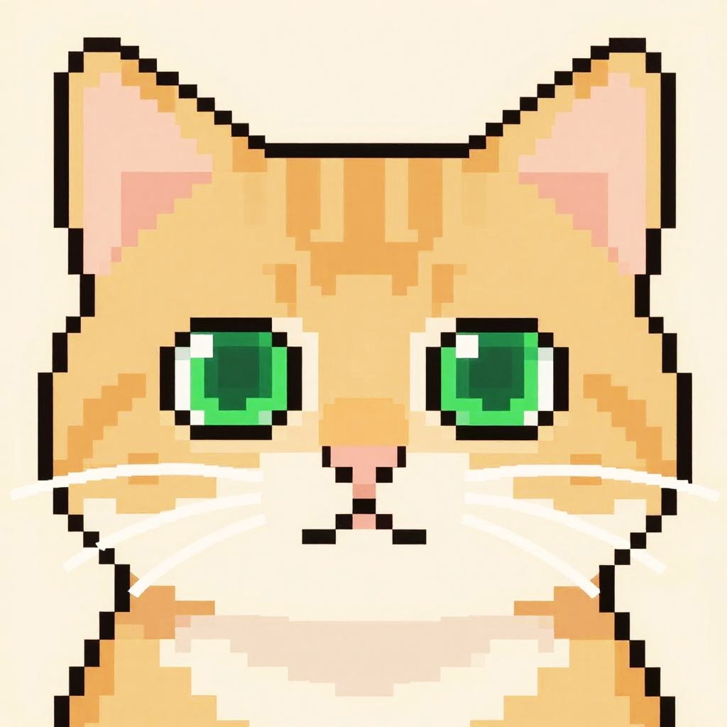 Pixel art cat face, vibrant retro style, detailed whiskers and emerald green eyes, soft pastel background, 8-bit gaming vibe, sharp pixel edges