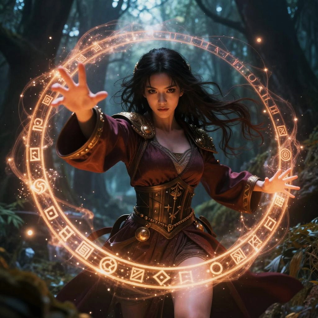 Midjourney anime portrait of a strong female mage casting a magical spell, surrounded by swirling energy and glowing runes, set against a dark enchanted forest backdrop with ethereal light effects and rich textures.