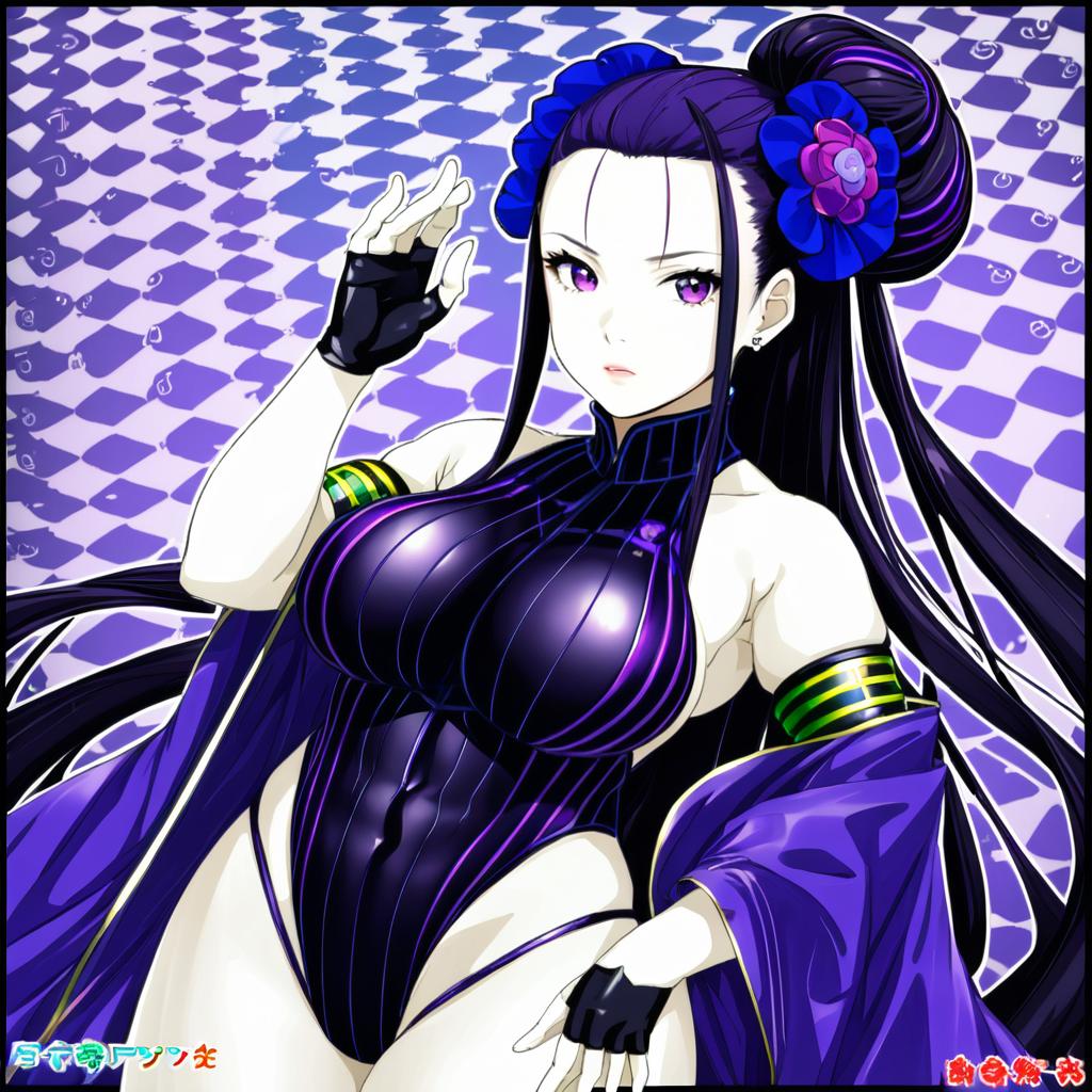 Murasaki shikibu (swimsuit rider) (first ascension) (fate), fate/grand order, 1girl, purple eyes, long hair, purple hair, tied hair, black hair, hair flower, large breasts, thighs, covered navel, black one-piece swimsuit, highleg swimsuit, half gloves, fingerless gloves, black gloves, bare shoulders, gold trim, armlet, shawl, by artist gomashio (goma feet), anime