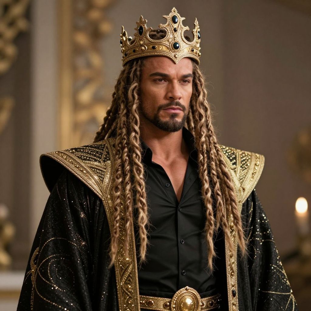 A striking, muscular man with long, intricate dreadlocks and a regal, ornate crown upon his head. He is wearing a luxurious black and gold costume, with a fitted black shirt visible underneath, exuding an aura of powerful royalty and mystery.