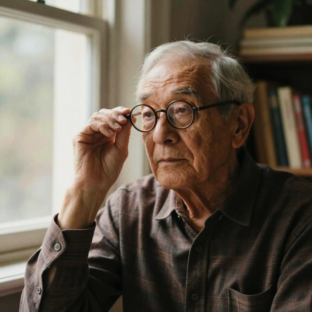 Add glasses to photo of an elderly man sitting by a window, vintage style, soft afternoon light, warm tones, wrinkled skin texture, round eyeglasses with thin frames, contemplative expression, cozy room interior with books and plants, realistic rendering