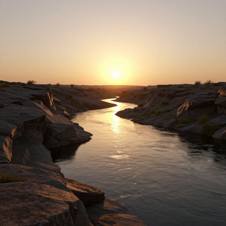 A serene 3D-rendered landscape captures a tranquil river winding through rocky terrain, reflecting the golden hues of the setting sun as it casts dramatic lighting across the scene, evoking a sense of peaceful solitude and natural beauty.