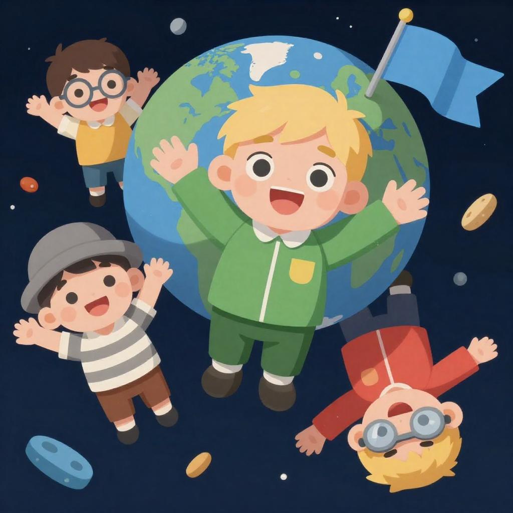 Illustration of four children floating in space. Central child with blond hair, wide eyes, and green suit, arms outstretched. To the left, a child in a gray hat and striped shirt, arms flailing. Bottom right, a child with goggles, blond hair, and red shirt, upside down. Top left, a child with brown hair, glasses, and a yellow shirt. Earth and blue flag in background. Scattered objects and debris around.