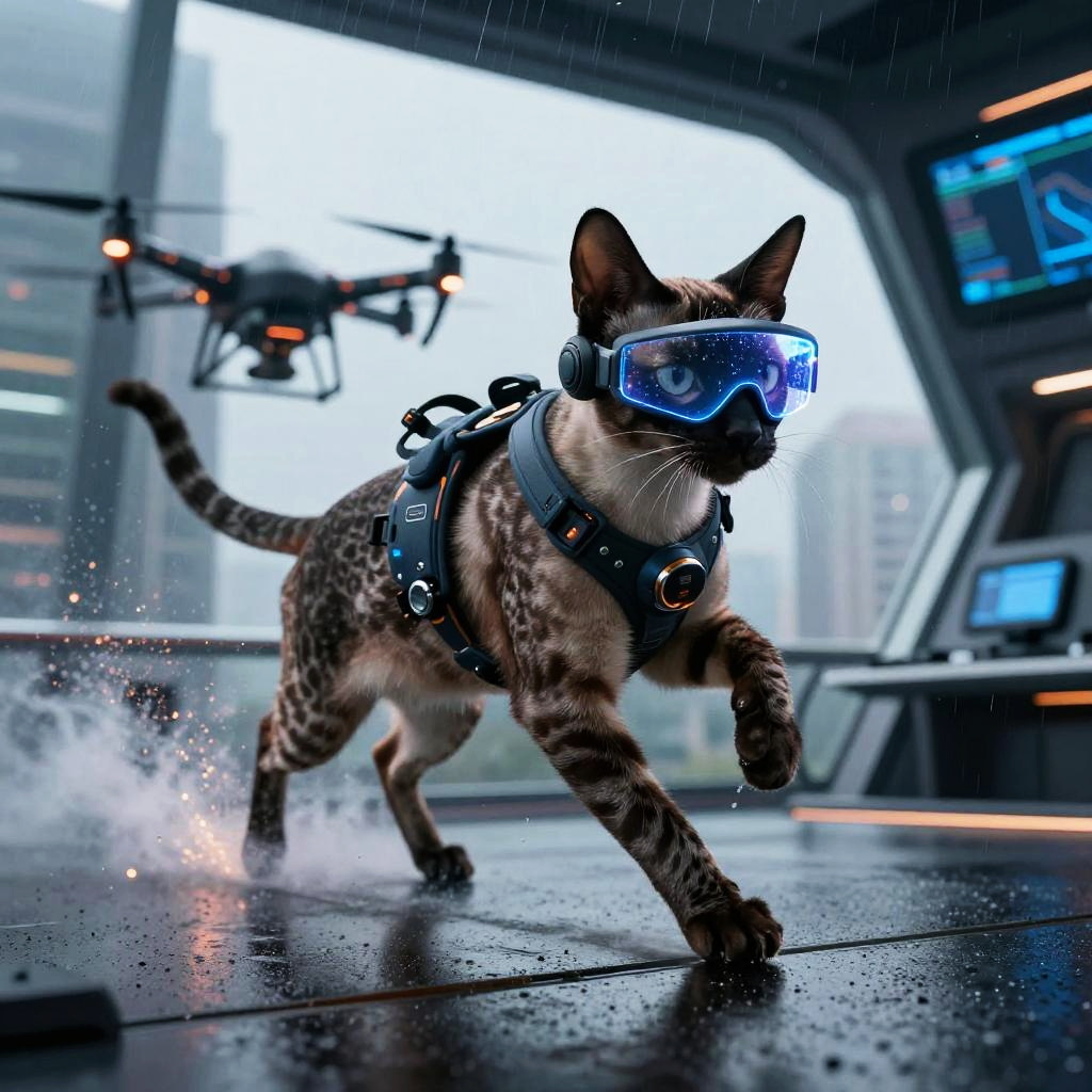 (full body) petite spotted Egyptian Mau cat, futuristic drone pilot with holo headset, in high-tech glass control tower overlooking metropolis, blue, black, and orange predominate, hyper-detailing, hyper-realism, tack sharp, cinematic splash screen energy, action-packed composition, dynamic pose, rain and sparks, embers, smoke plumes, glossy reflections, dramatic rim light, volumetric fog, motion blur trails, HDR, film grain, photoreal lighting, rich textures, epic mood