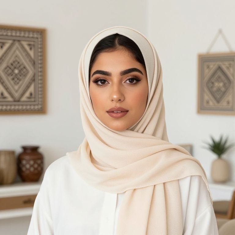 Photorealistic digital portrait of a young woman with medium brown skin, dark brown eyes, and arched eyebrows. She wears a cream-colored hijab and matching abaya, her makeup includes subtle pink lipstick and light eyeshadow. The background features a bright, white-walled room with two geometric-patterned wall hangings and a shelf with a brown vase and decorative items. The image has a soft, natural light, emphasizing the woman's calm and composed expression. The style is hyper-realistic, capturing fine details in her facial features and clothing.