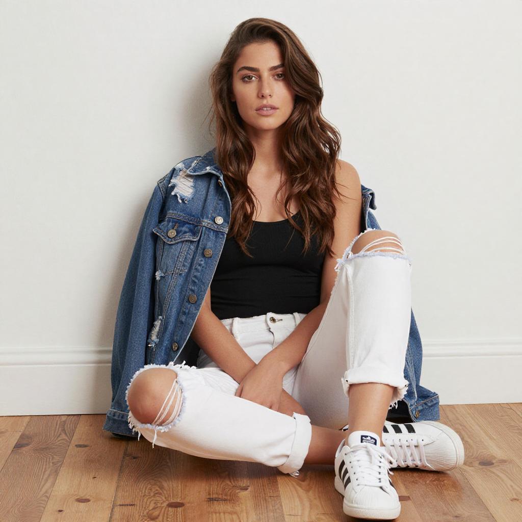 Photograph of a young woman with long dark hair in a high ponytail, wearing round sunglasses, a denim shirt, and white sneakers, sitting on a cobblestone path against a vibrant red wall and weathered wooden door. She has a confident expression and is positioned with one leg crossed over the other.