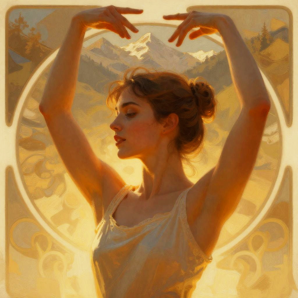 Digital painting of a serene, fair-skinned woman with brown hair in a bun, wearing a white sleeveless top, arms raised, glowing golden sunset