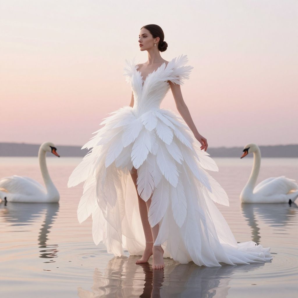 Swan dress inspired by elegant white swans, with delicate feathers and flowing layers, worn by a stylish figure standing gracefully on a reflective lake surface at sunset, soft pastel colors, fantasy fashion illustration.