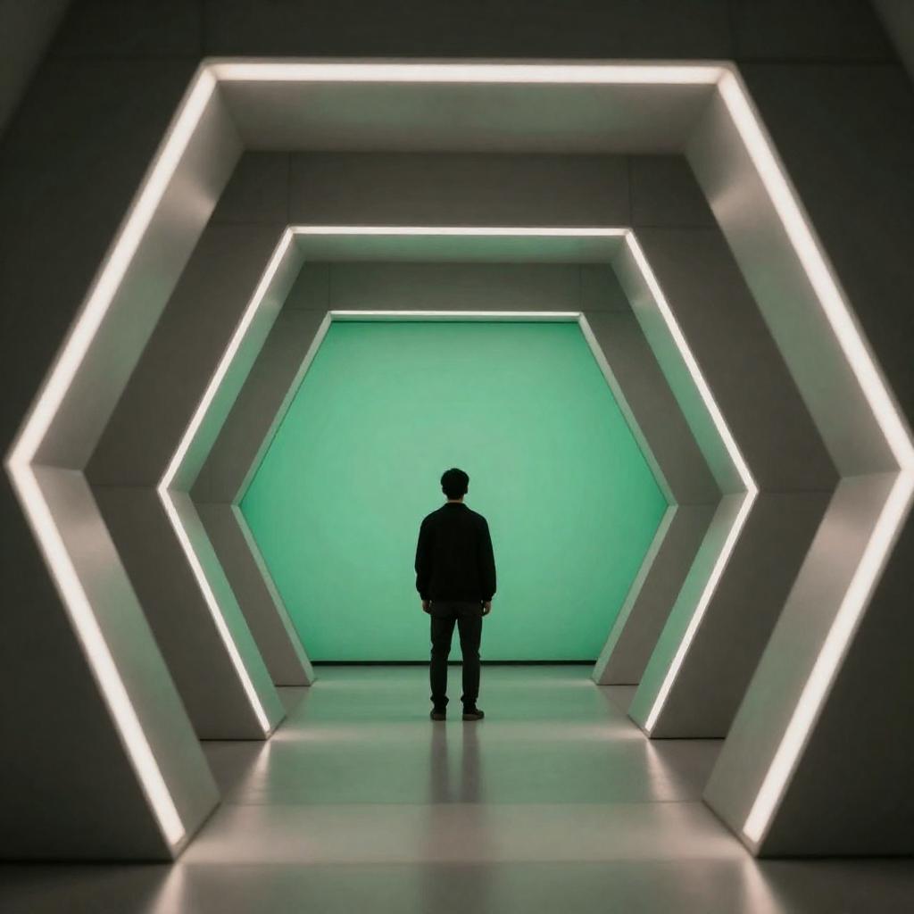 Photograph of a futuristic corridor with geometric, metallic walls and glowing white lights. A lone figure in dark clothing stands at the center, facing a vibrant green, illuminated wall. The corridor's design creates a tunnel effect, emphasizing depth and perspective. The scene is illuminated by both natural and artificial light.