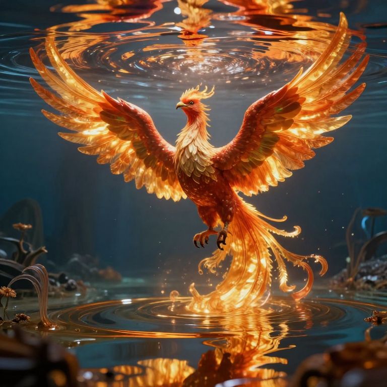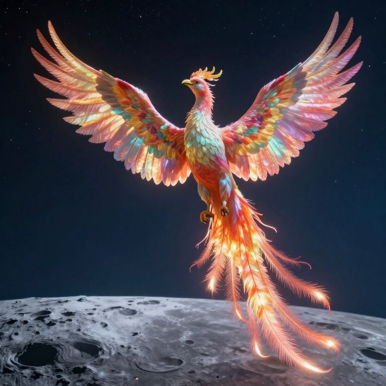 A dreamlike landscape, reminiscent of surrealism's enchanting allure and the vibrant hues of Van Gogh's famed nocturnal masterpiece, unfolds before us. In this serene scene, an awe-inspiring phoenix with wings that shimmer like iridescence rises from a tranquil lake under the soft glow of a crescent moon. The celestial light bathes the bird in a silvery sheen, casting mesmerizing reflections upon the still waters below and creating an ethereal ballet of light and shadow. This panoramic view, captured from a unique 'bug's-eye perspective,' beckons viewers to immerse themselves in a world where wonder, awe, and enchantment seamlessly intertwine, painting a captivating tapestry of mysticism and surrealism against the backdrop of nature's timeless beauty.