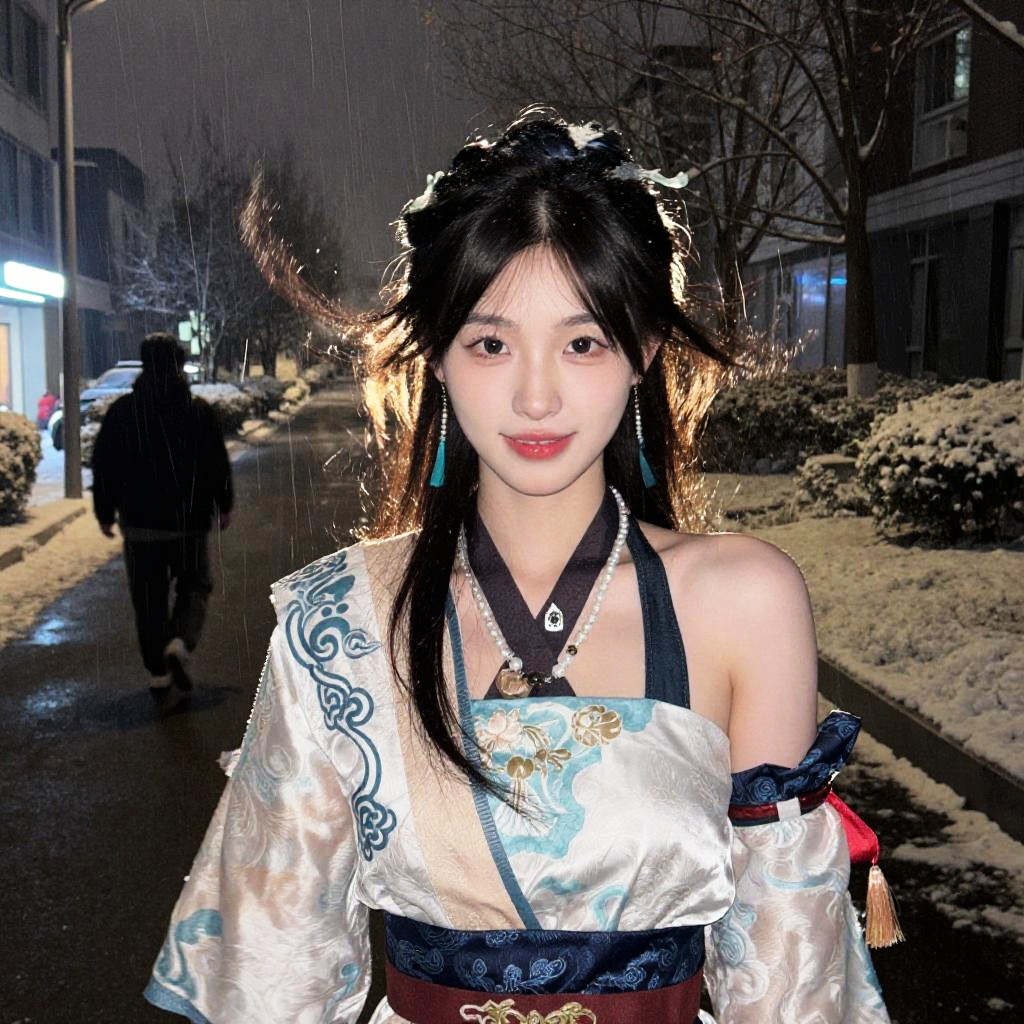 18 y.o chinese girl, (highly clear face, very cute, Extremely cure beauty, Sexy self-confidence, proud and independent, Clear perfect eyes, phenomenal aesthetic, Amazing photos), pearl - like eyes, street at night, (wind:1.2), heavy snow, crazy body movements, exaggerated perspective, strong tones, 32k UHD, (eye close-up:1.2), Realistic, sexy, (smile:0.5), medium breasts, soft backlight, Masterpiece, (pore:1.3), (film grain:1.5), triangular face, (hair pin, earrings, necklace), martial arts, hanfu, tang style outfits, genshin impact