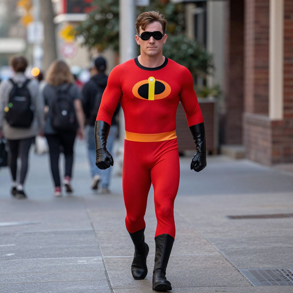 "Dash Incredibles, man in a red and yellow costume walking down a street"