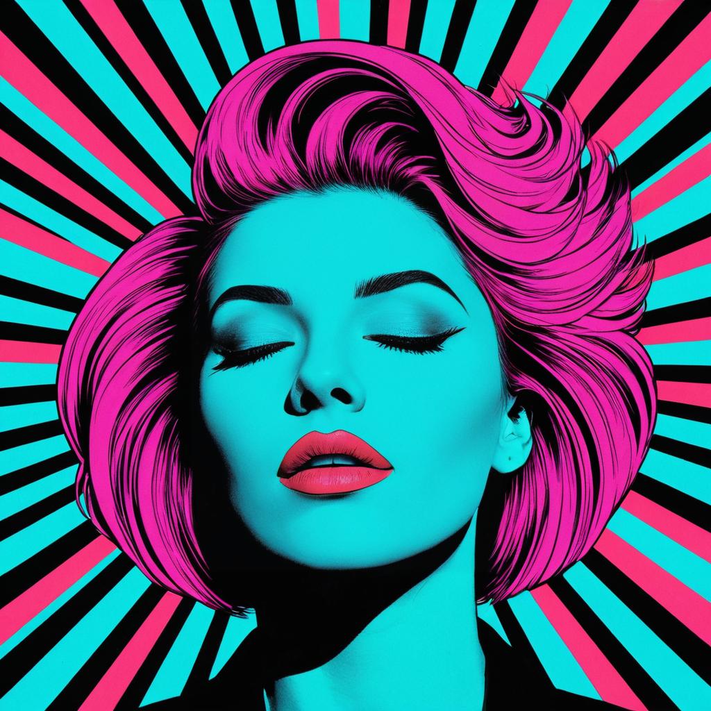 Bold pop art portrait of a woman with sleek metallic silver hair, eyes closed, wearing vibrant turquoise eyeshadow and crimson lipstick. The background features dynamic radial lines and abstract shapes in an electric lime palette, evoking a retro 1980s comic book style with sharp lines and vivid color blocking.