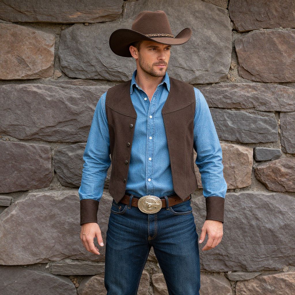 Rawhide Renegade Costume, dressed in a western outfit and hat standing in front of a stone wall