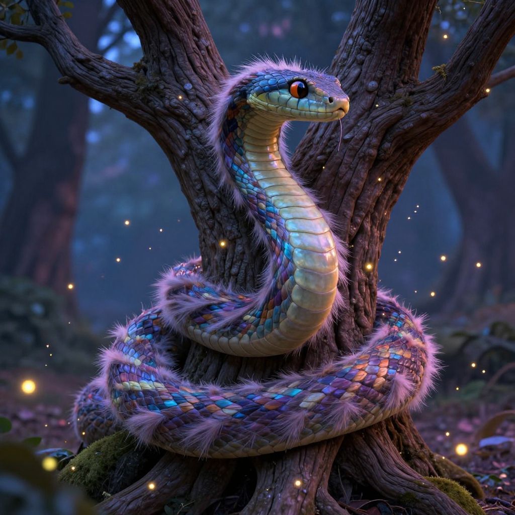 Fluffy snake art portraying an elegant serpent wrapped around a twisted ancient tree, its fur lush and multicolored, set in a magical twilight forest, with glowing fireflies and sparkling magical dust enhancing the enchanting, otherworldly vibe.