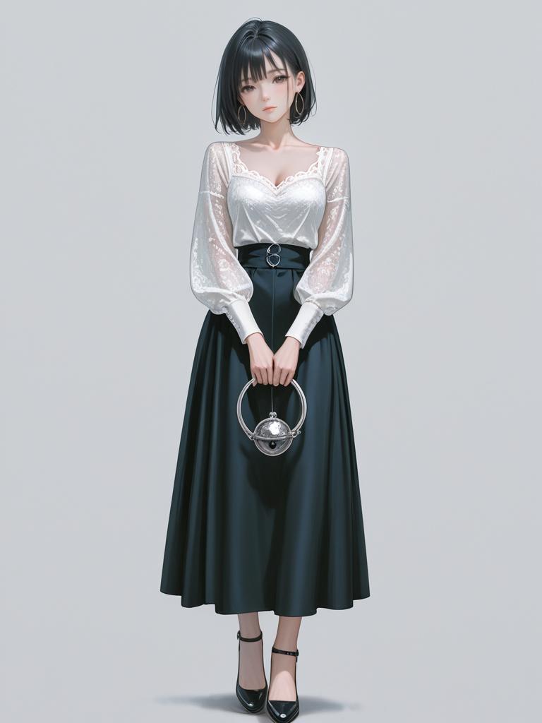 Digital illustration of a young Asian woman with straight, black bob-cut hair, wearing a white, long-sleeved, semi-sheer blouse with a subtle floral pattern, and a high-waisted, black, A-line skirt that reaches her ankles. She holds a black, round-handled handbag in front of her with both hands. Her outfit is completed with black, high-heeled shoes. The background is a plain, light gray, making her the focal point. The image has a clean, modern, and slightly minimalist style with high contrast and sharp details.